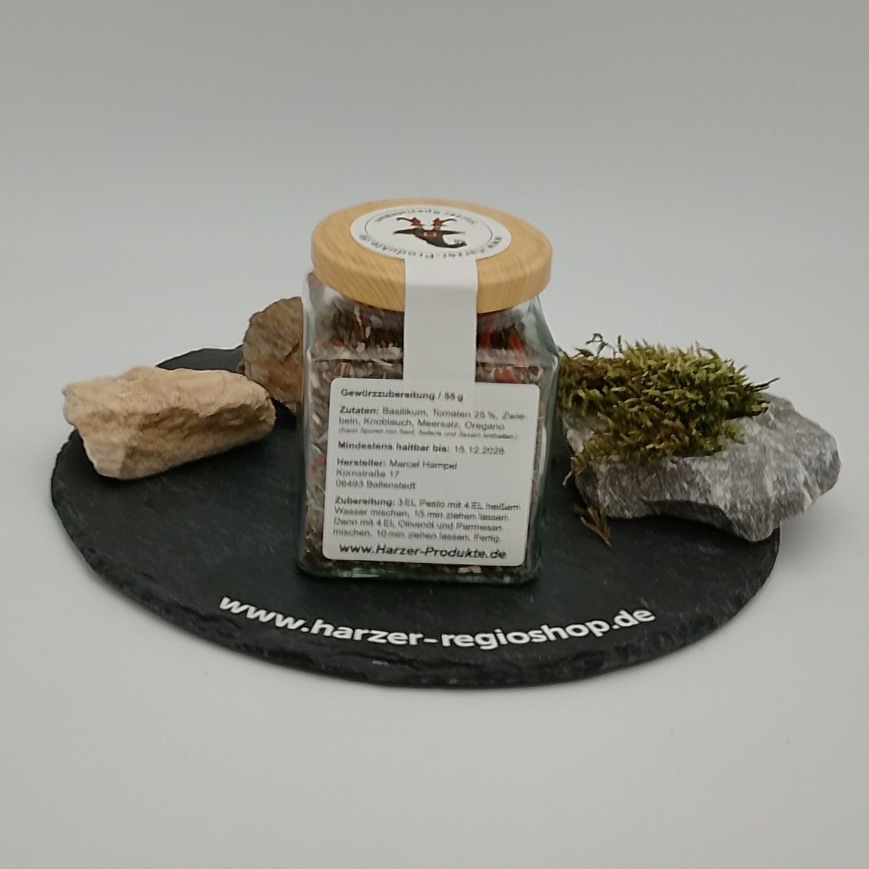 Zutaten: Basilikum, Tomaten 25 %, Zwiebeln, Knoblauch, Meersalz, Oregano